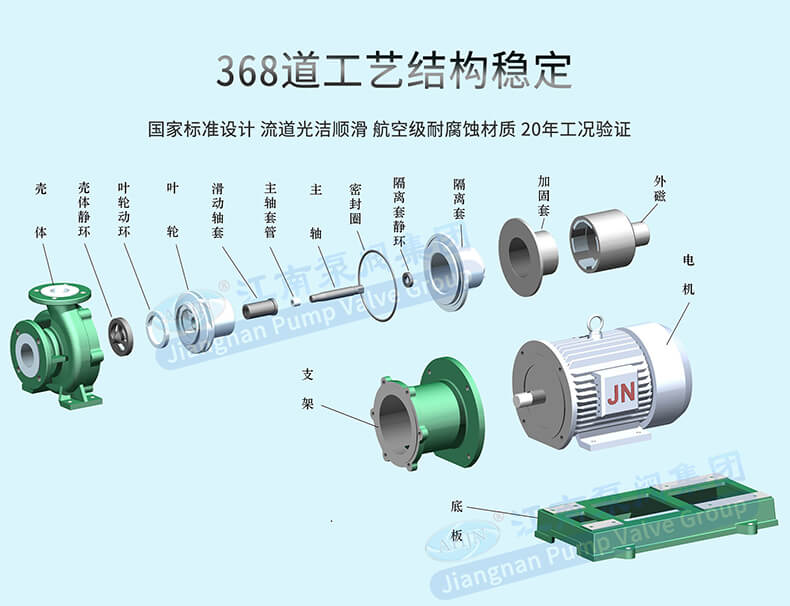 - 该泵具有耐颗粒、抗干磨、高效节能、运行稳定、静音低振、可靠性高、寿命长等同类氟塑料磁力泵无可比拟的优点,突破了传统氟塑料磁力泵使用限制,是强腐蚀、有毒、易挥发、易燃易爆、有机溶剂和贵重液体理想的环保输送设备。